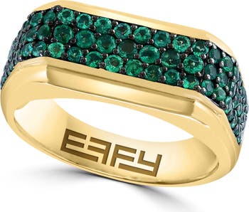 Three rows of faceted emeralds lend depth, dimension and rich color to a 14-karat gold-plated ring fashioned into a slender signet silhouette.