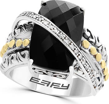 A slender row of white diamonds arches over the faceted onyx on this ring crafted from polished sterling silver and flanked with round 18-karat gold accents.