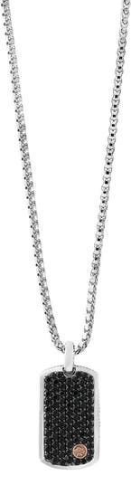 Pavé black sapphires enrich this dog-tag pendant necklace crafted from polished sterling silver and 18-karat rose gold.