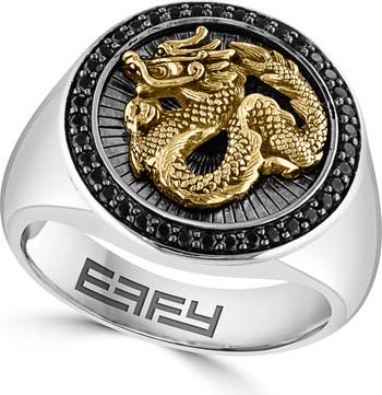 Round-cut prong-set black spinels frame a sterling silver ring that features an etched 14-karat gold dragon.
