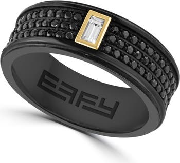 A baguette-cut white sapphire framed in warm 18-karat gold highlights a black-plated sterling silver ring illuminated by pavé black spinel.