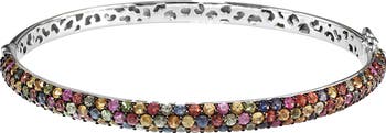 A hinged bracelet shaped from sterling silver is covered in pretty round-cut sapphires boasting a multicolor palette to give striking detail against elevated looks.
