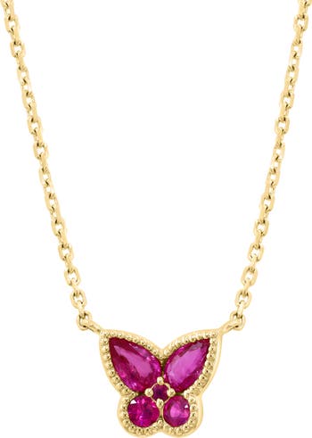 Teardrop- and round-cut natural rubies compose a beaded butterfly pendant strung on a chain necklace crafted from goldtone plated sterling silver.