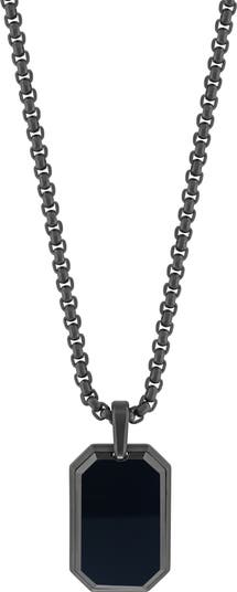 A dark-black onyx center brings dramatic shine to a geometric tag pendant suspended from a polished chain necklace made from titanium.