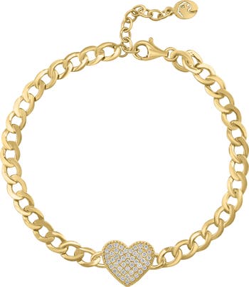 A pavé heart brings lovely shine to this curb-link bracelet plated in warm 14-karat gold.