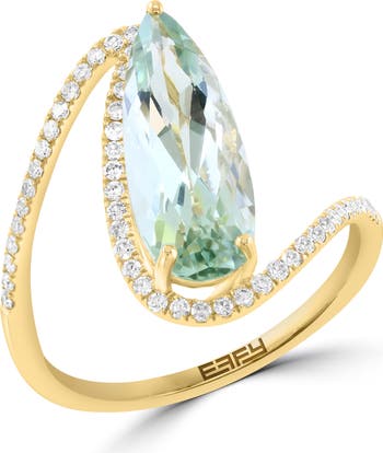 A fluid line of sparkling diamonds frame a pear-cut green quartz on this sculptural ring crafted from sterling silver with a warm goldtone finish.