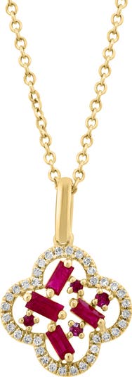 Mixed-cut rubies and round diamonds bring luxurious sparkle to this open-clover pendant necklace crafted from sterling silver with a warm goldtone finish.