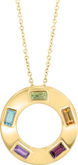 Colorful bezel-set baguette-cut semiprecious stones station around an open-circle pendant strung on a sterling silver chain necklace plated in 14-karat gold.