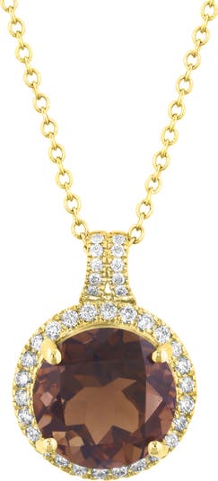 A round smoky quartz framed by a sparkly diamond halo illuminates this dainty necklace crafted from sterling silver wtih a warm goldtone finish.