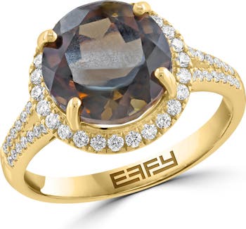 A prong-set round smoky quartz is framed by a diamond halo and embellished band on this glamorous ring crafted from sterling silver with a goldtone finish.