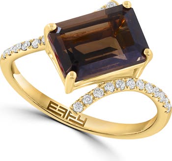 Sparkly diamond swirls frame an emerald-cut smoky quartz on this elegant ring crafted from sterling silver with a warm goldtone finish.