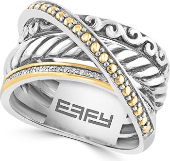 Tiny white diamonds sparkle upon one of the intertwining bands of this crisscrossed ring crafted from 18-karat gold and sterling silver.