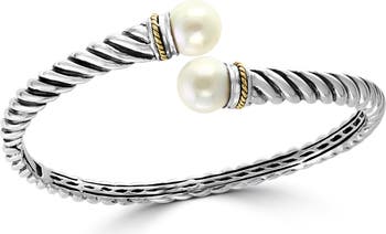 Cultured freshwater pearls frame this elegantly twisted cuff bracelet crafted from polished sterling silver and warm 18-karat gold.
