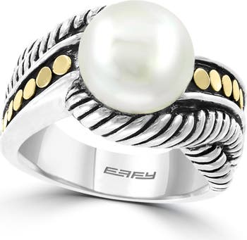 A lustrous freshwater pearl sits at the center of this twisted ring crafted from polished sterling silver and flanked with round 18-karat gold accents.