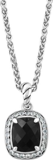 An elegant sterling silver necklace suspends a black onyx pendant with a sparkling white topaz halo for luxurious style.
