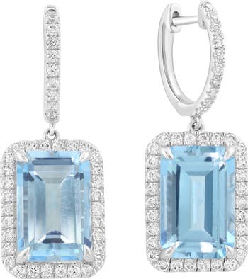 Emerald-cut blue topaz drops with sparkly zircon halos illuminate these elegant huggie hoop earrings crafted from polished sterling silver.