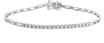 Round-cut white diamonds are prong-set along this timeless bracelet boasting polished links.