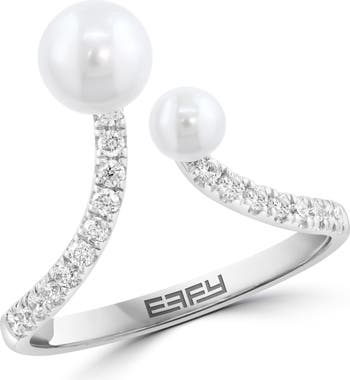 Sparkling round diamonds and lustrous freshwater pearls enrich this elegant open-band ring crafted from polished sterling silver.
