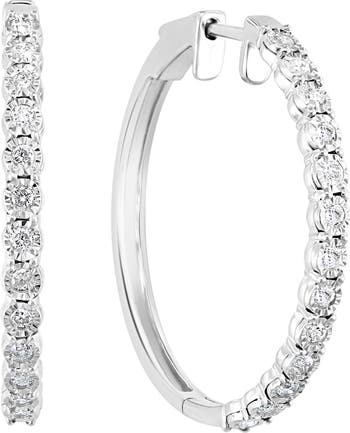 Bright-cut set round diamonds illuminate these elegant hoop earrings crafted from polished sterling silver.