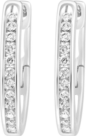Channel-set round diamonds bring luxurious sparkle to these oval huggie-hoop earrings crafted from polished sterling silver.