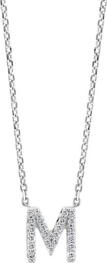 Sparkling white diamonds compose an 'M' pendant strung on a sterling silver chain perfect for a personalized look.