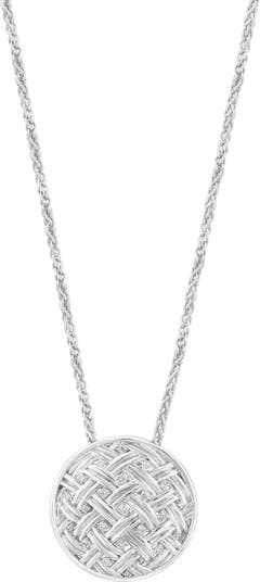 Dainty prong-set round diamonds bring luxurious sparkle to this basketweave-textured medallion pendant necklace crafted from polished sterling silver.