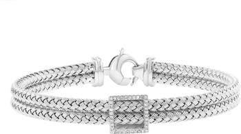 A square charm traced by dainty round diamonds illuminates this elegant woven-chain bracelet crafted from polished sterling silver.