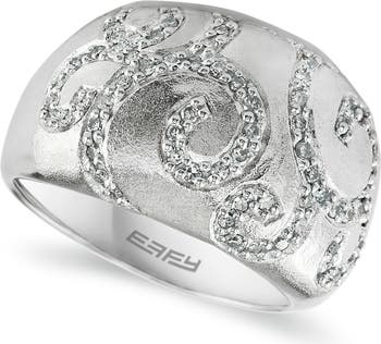 Brilliant diamonds fill the swirls laid into a wide-band ring finessed in a satin-textured sterling silver for a lasting luster.
