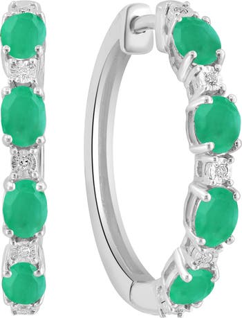 Prong set diamonds and emeralds accent all around these sterling silver hoop earrings for a sleek look.