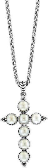 Showcase your faith in lustrous shine with this cross necklace filled with freshwater cultured pearls.