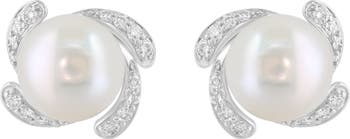 Dainty round diamonds swirl around lustrous freshwater pearls on these elegant stud earrings crafted from polished sterling silver.