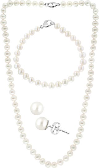 Glossy freshwater pearls add polished sophistication to this matching 3-piece set featuring an elegant necklace, bracelet and glamorous stud earrings.