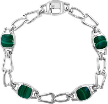 Sculptural links enhance the shine of a sterling silver bracelet fashioned with malachite stone stations for a bold pop of color.