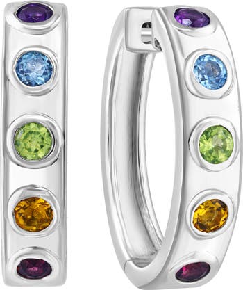 A vivacious stone assortment of amethyst, blue topaz, citrine, rhodolite garnet, rhodolite and iolite outlines these endless hoops crafted in sterling silver.