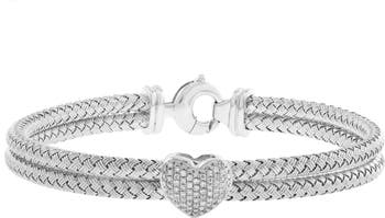 Sparkly pavé diamonds illuminate a romantic heart on this double woven-chain bracelet crafted from polished sterling silver.