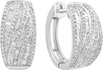 Pavé round and baguette-cut diamonds illuminate these wide huggie hoop earrings crafted from polished sterling silver for elegant shine.