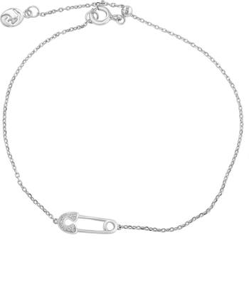 Pavé diamonds bring dainty sparkle to a contemporary safety pin pendant bracelet crafted from polished sterling silver.