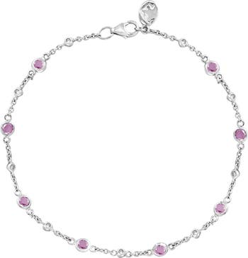 Bezel-set pink sapphires and dainty round diamonds enrich this slender station-chain bracelet crafted from polished sterling silver.
