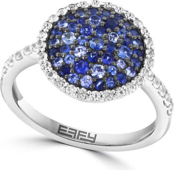 A cluster of sapphire and a stunning halo draw the eye to this polished ring that brings instant glamour to any night-out attire.