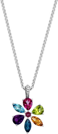 A rainbow spectrum of semiprecious gemstones give whimsical flair to a flower pendant necklace set in sterling silver.