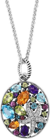 Colorful semiprecious stones and a pavé diamond star fill this oval-shaped pendant strung on a sterling silver chain.