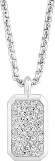 Pavé white sapphire stones sparkle along a dog tag pendant that is set on this elegant sterling silver box chain necklace.