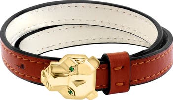 Prong-set tsavorite stones detail the eyes of this panther head buckle of this slender leather bracelet.
