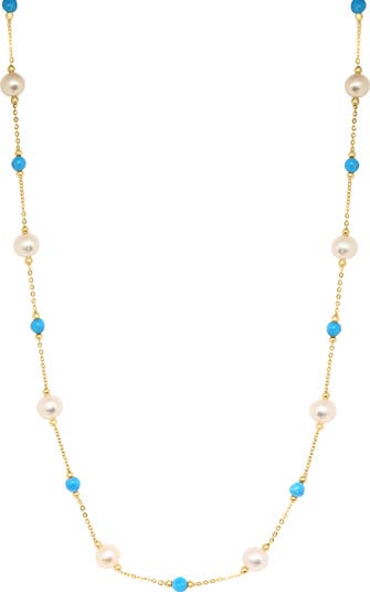 Freshwater pearls lend an air of elegance to this polished chain necklace that's shaped from warm 14-karat gold with turquoise stations.