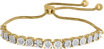 Dainty bright-cut diamonds adorn a luxurious two-tone slider bracelet crafted from sterling silver and 14-karat gold plate.