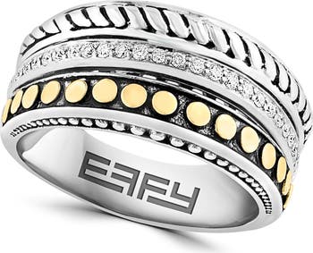 Prong-set round diamonds enhance the luxurious shine of this textured-band ring crafted from sterling silver and warm 18-karat yellow gold.