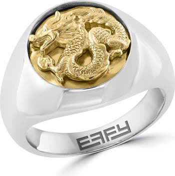 A dimensional dragon enriches this polished signet ring crafted from gleaming sterling silver and plated in warm 14-karat gold.