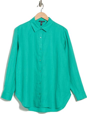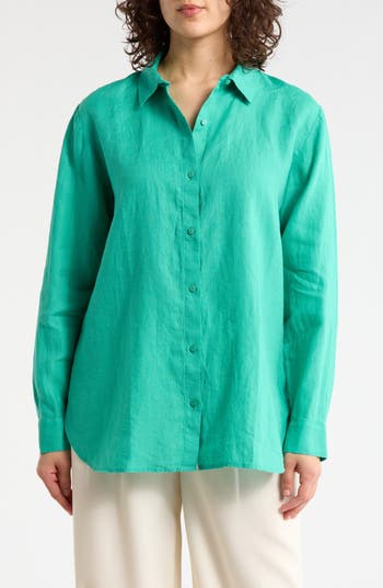 Organic-linen fabrication gives a light and airy feel to a staple button-up shirt rendered in a solid hue for easy, everyday pairing.