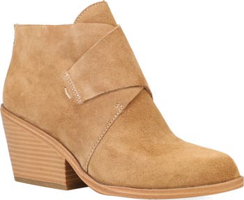 A pointy toe and angled block heel balance a sleek leather bootie fashioned with a crossover silhouette and back zipper for easy entry.