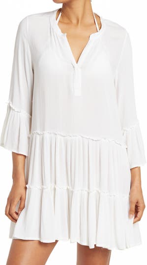 This A-line mini dress features a ruffled skirt and 3/4 ruffled sleeves.